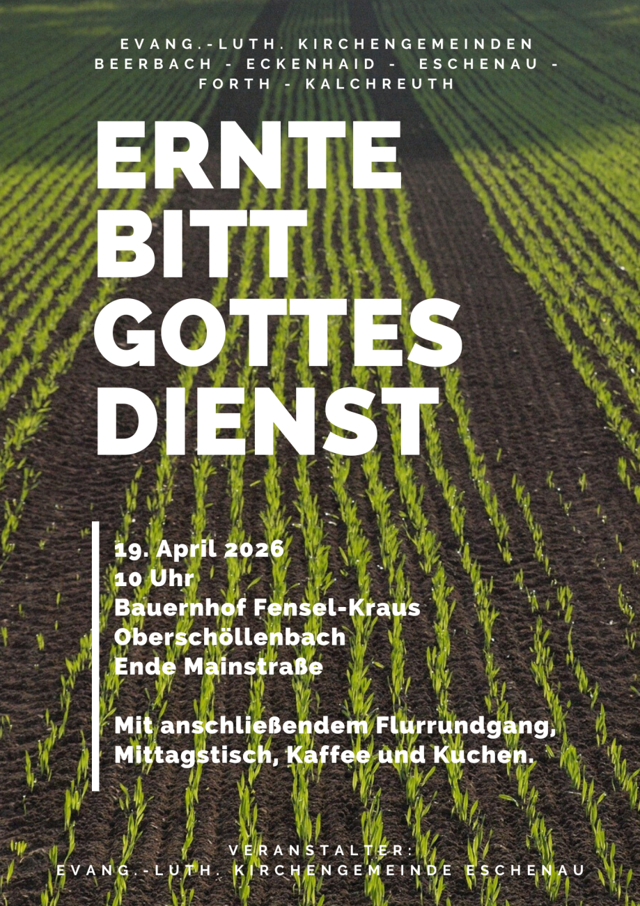 Zu einem Erntebittgottesdienst landen die evangelischen Kirchengemeinden Beerbach, Eckenhaid, Eschenau, Forth und Kalchreuth am 19. April um 10 Uhr in Oberschöllenbach ein. Während den Erntedank viele kennen, ist die Erntebitte zumindest in evangelischen Kirchengemeinden in unserer Gegend nicht sehr verbreitet. Doch Erntebitte und Erntedank machen gemeinsam deutlich, dass es nicht selbstverständlich ist, dass die menschliche Arbeit und die Natur zusammen Lebensmittel hervorbringen. Erntebittgottesdienste lehren die Wertschätzung für Lebensmittel, für die Arbeit der Landwirtinnen und Landwirte und für die Natur. Vor allem bitten sie Gott um eine gute Ernte.